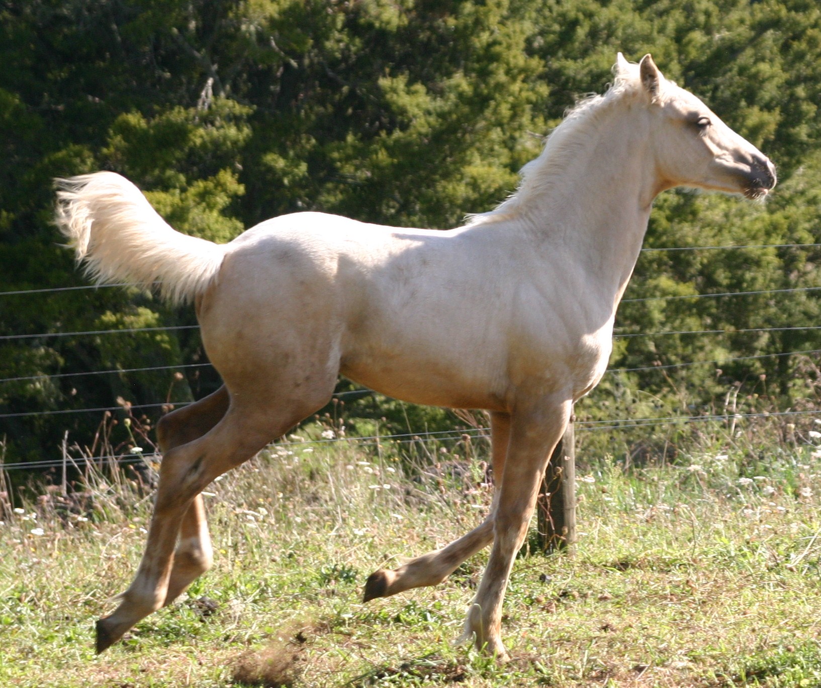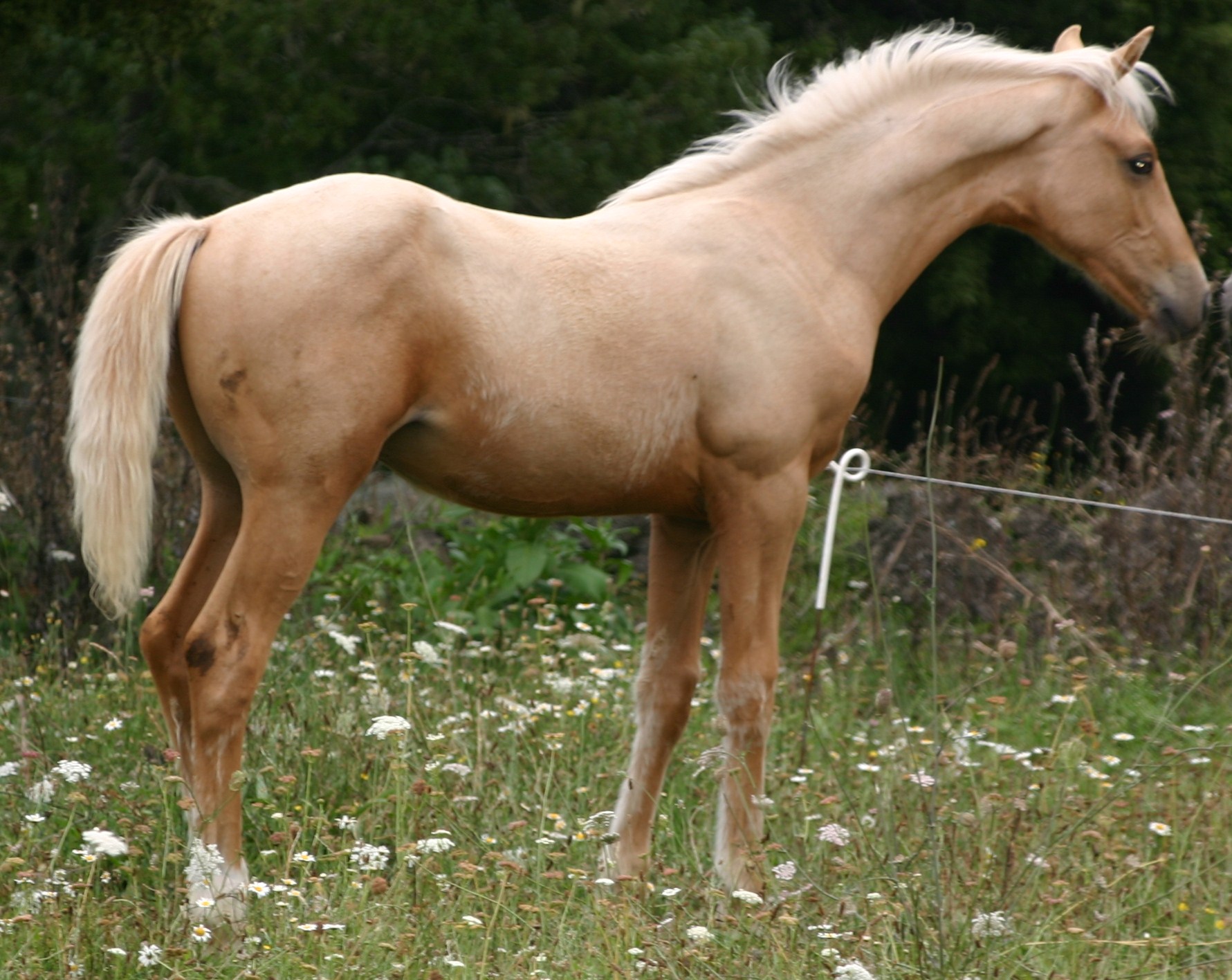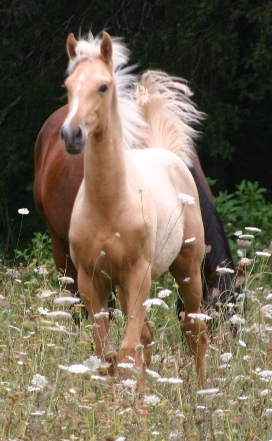 Dram is a beautiful, big palomino colt by Casper out of a TB mare, Jay (an outside mare). He has inherited the striking white markings of his dad and apparently has a lovable and friendly nature.