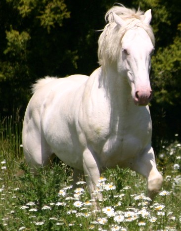 Being cremello Casper is guaranteed to produce coloured offspring ie palomino or buckskin. Further information can be found as to the likely colour of the offspring at colour genetics. As well as producing colour Casper has inherited three white stockings and a blaze (no longer visible due to his pale colouring) making it likely that his progeny will also have a lot of 'chrome'.