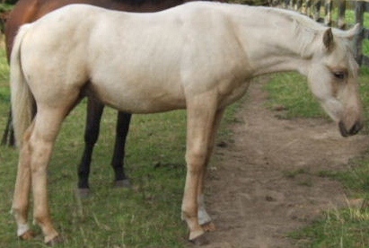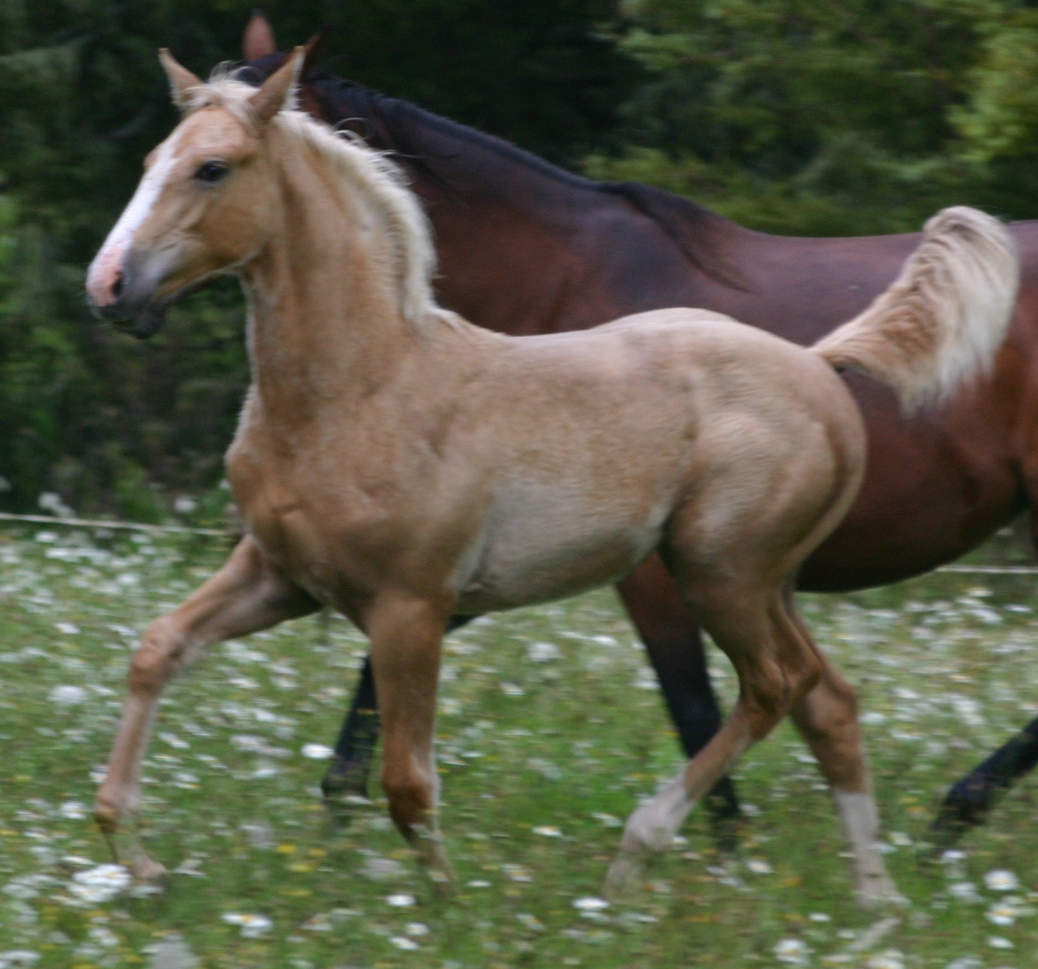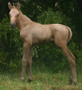 Here's a foal with a bit of difference. Bleu is by JK Sacramento (Holsteiner) out of Chakita (TB/Stationbred mare). As can be seen he's the typical palomino colouring but unfortunately (for me) has inherited the grey gene of his sire and will eventually turn grey.
